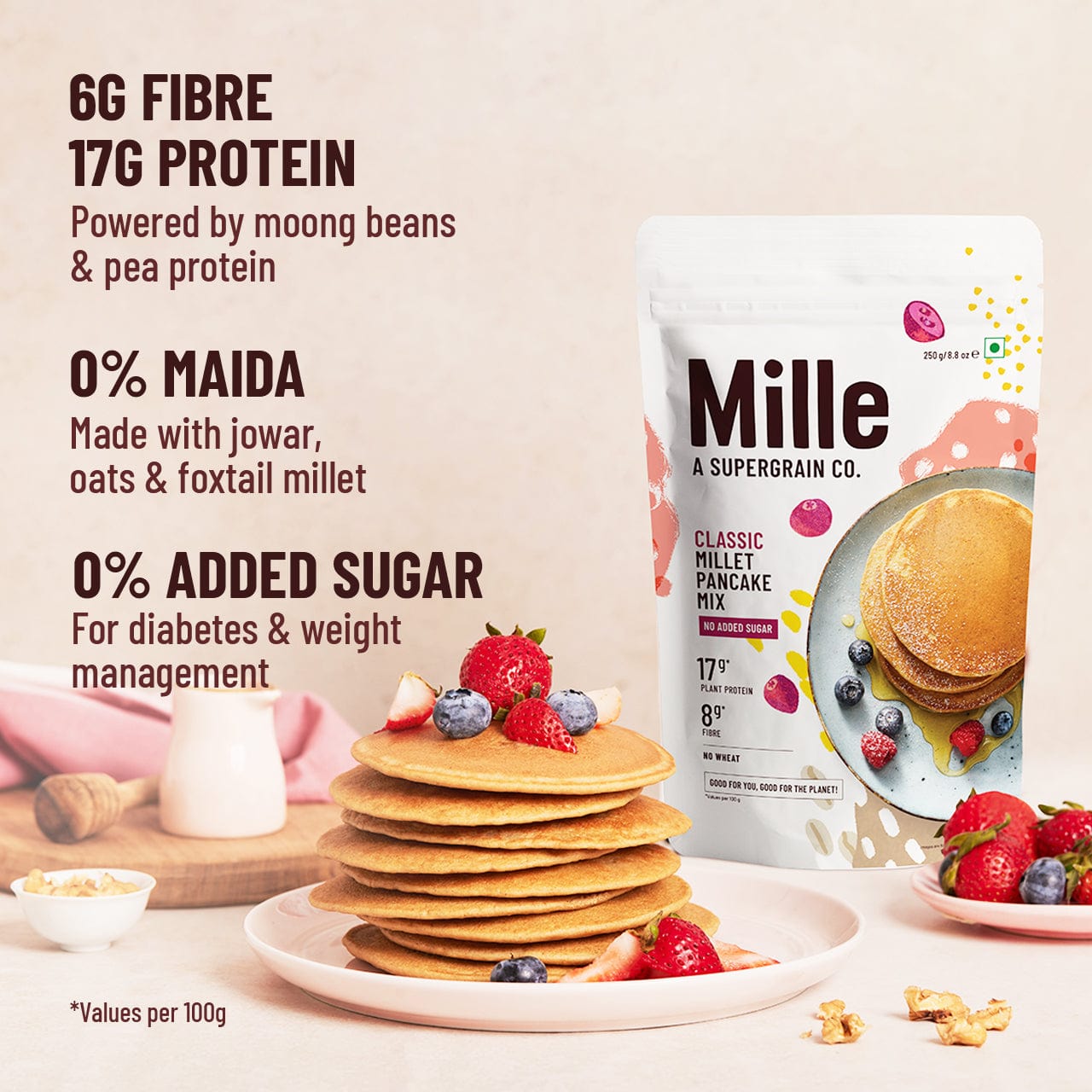 We use a combination of millets (naturally high in protein) & added plant-based protein to achieve those 17g of protein. It’s thoughtfully formulated to support your daily protein goals, especially for vegetarian or active lifestyles.