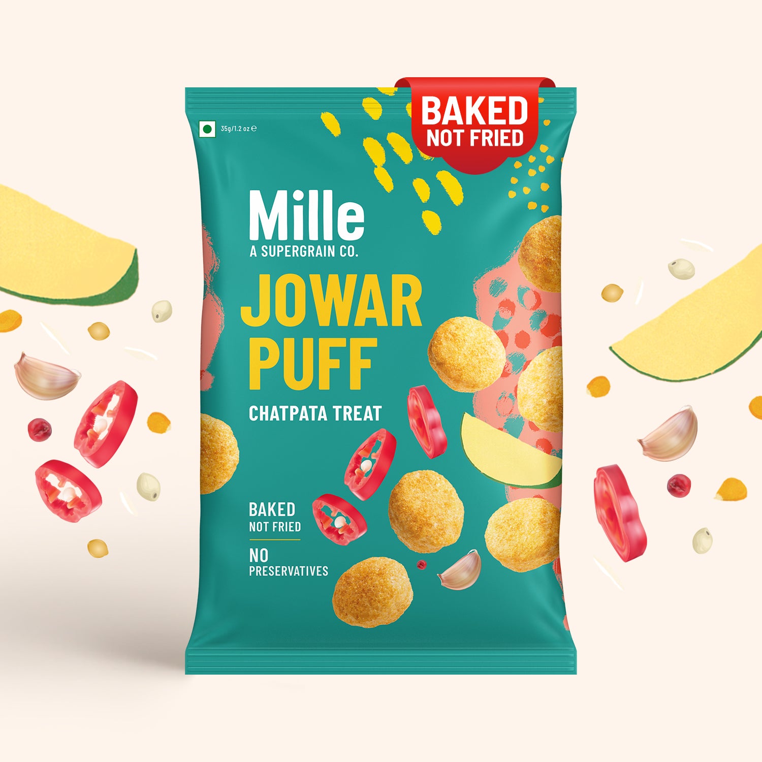 • Made with jowar, Chatpata Treat Puffs are baked, and not fried